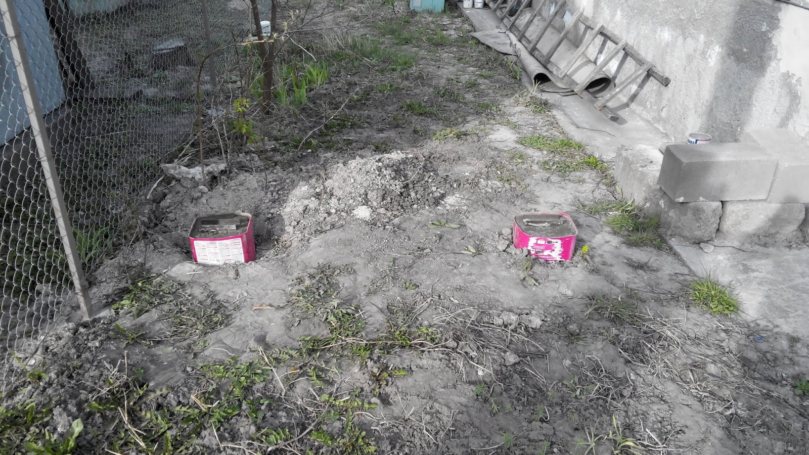 Утренний кофе был окончен еще одним слоем краски:) Ночью все покрылось изморозью почти в пале толщиной:) Надеюсь, что заморозки последние. Перешел к будущему второму столбику решетки винограда. Пришлось пересадить два куста малины - скважина как раз на месте была. Второй столбик был залит в ударные сроки и через каких то полчаса я освободился.
