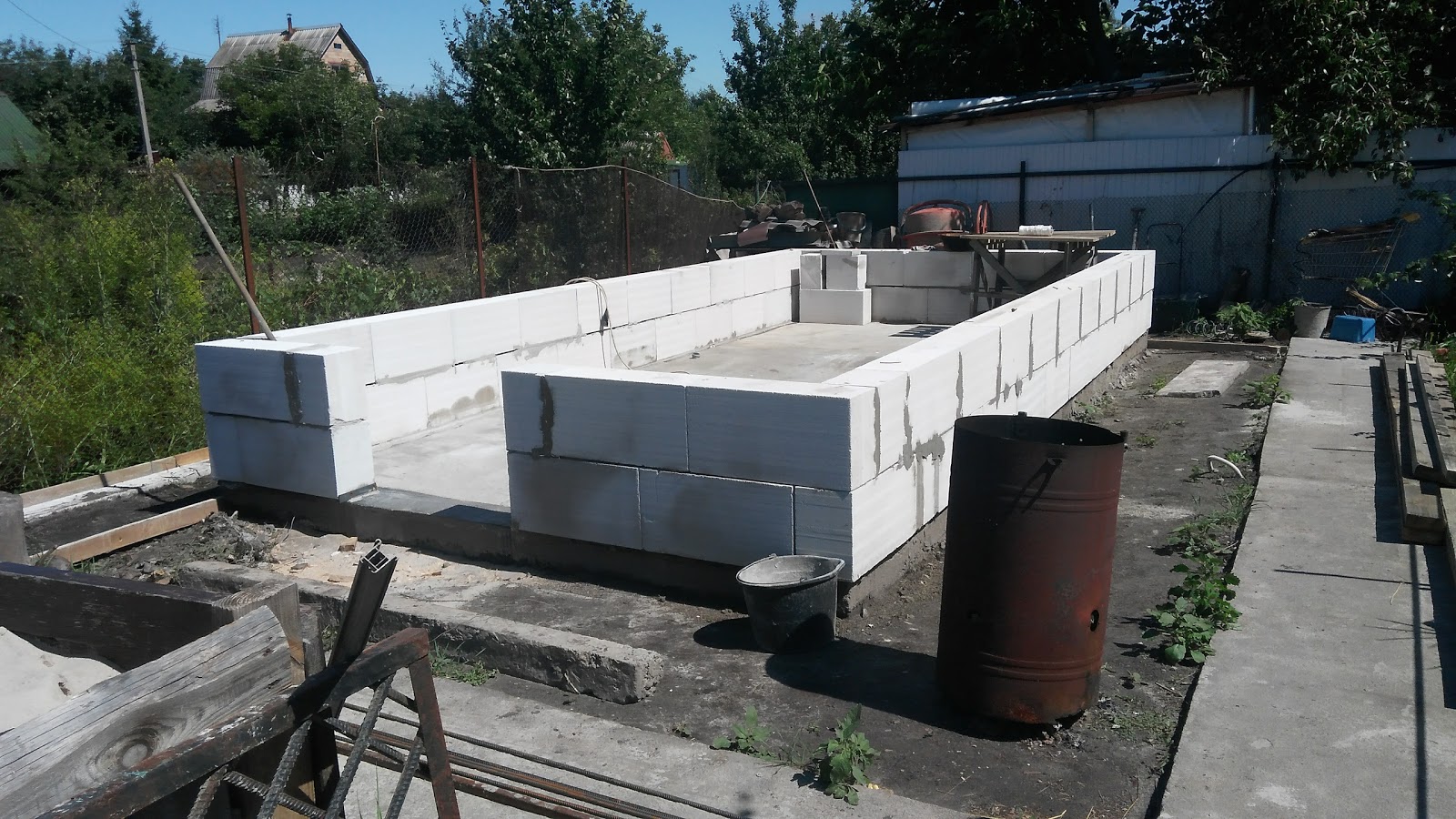 Убрал все в исходное состояние, да решил уложить оставшиеся блоки - их у меня скопилось аж десяток. Работать приходится уже с козел, причем регулярно вверх-вниз. Последние два ряда будут трудными и долгими, но к счастью - они последние. Параллельно с укладкой сделал расшивку швов на части стены - надеюсь на следующих выходных я уже протяну всю внутрянку.